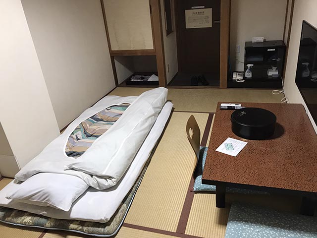 ホテルは和式。風呂トイレは共同。宴会場とかあって、昭和な感じ。